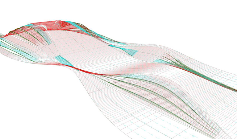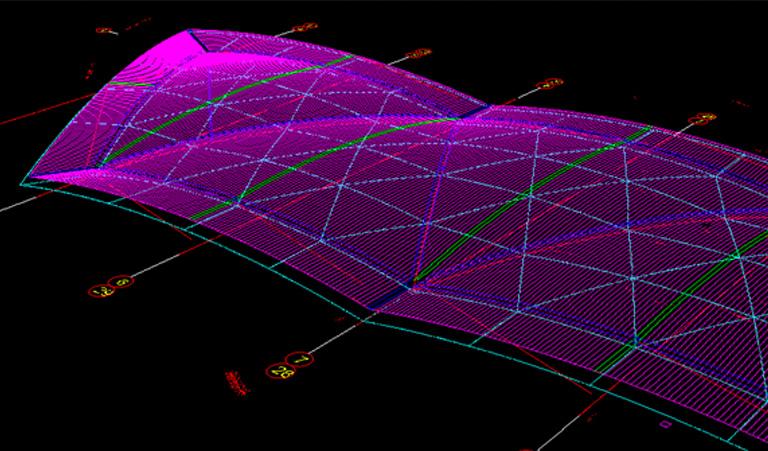 Based on roof modeling, a comprehensive evaluation is performed on factors such as the drainage direction, drainage capacity, deformation adaptability and field installation operability of roof panels and the drainage capacity and appearance effect of gutters, and proper plane layout of roof is made.
