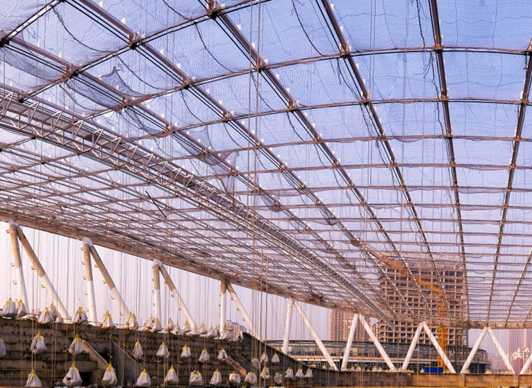 一些特殊的结构体系如单层索网结构,其显著特点是结构自身有较大的水平变形和垂直变形,当采用膜等柔性材料为屋面材料时,并不会对屋面