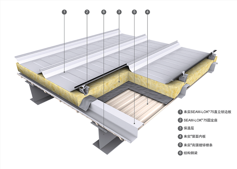 来实? 系统双层彩钢板屋面,内填保温棉,屋面均匀地分布着条状与点状结合的采光带和排烟窗,同时满足消防、自然通风、采光的要求且有效节约能源。