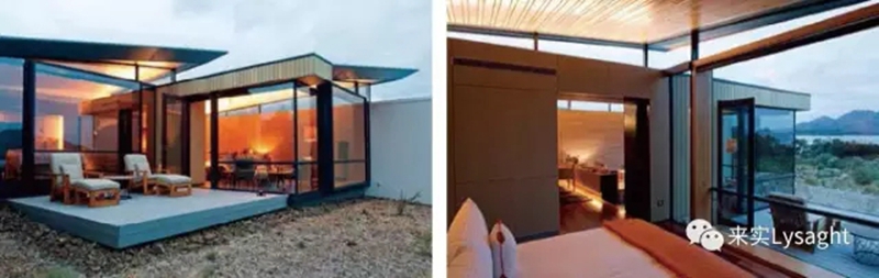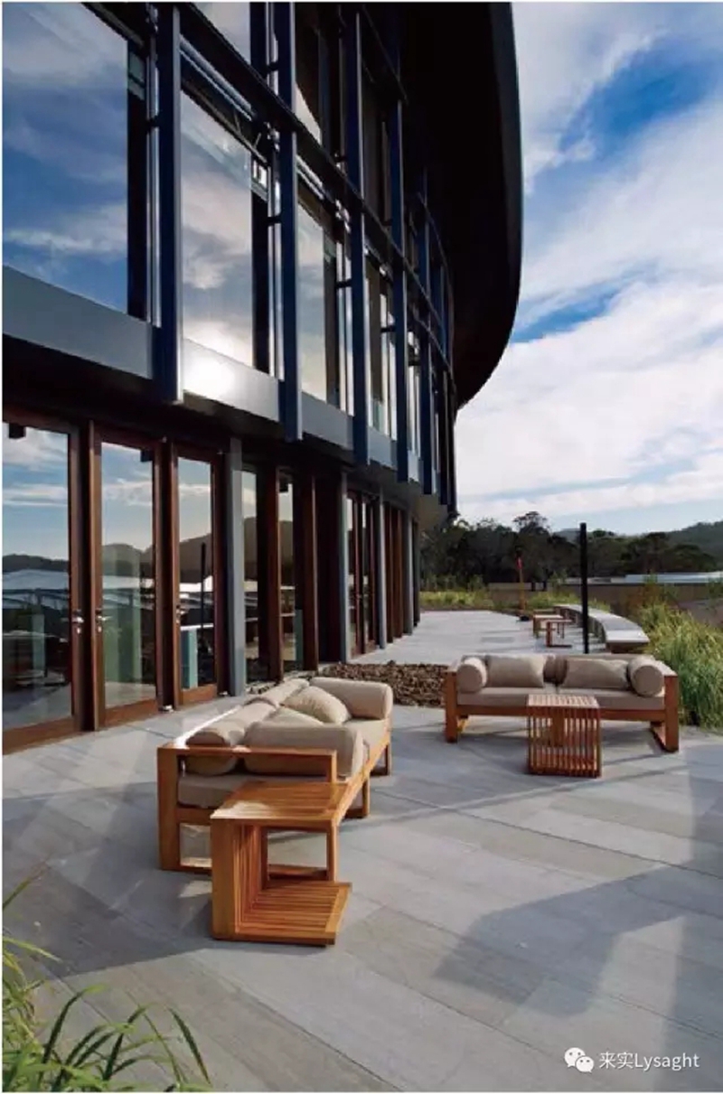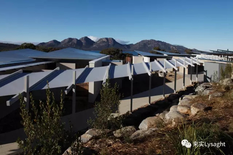 套房屋面中间采用钢檩条,收边采用槽钢。屋面角部向上翘起,极具视觉冲击。为与周围环境相协调,项目大量用Surfmist?、Dune?、WoodlandGrey?和Windspray?色调的恒丽?板制成的围护系统和雨棚。