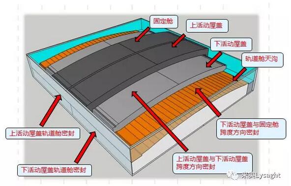 2、来实?结合项目特点,在屋面防水处理上提出了一个系统整合方案,结合了主屋面环形天沟、轨道天沟集水井布置、轨道舱天沟处封堵、活动屋盖与固定屋盖的相对关系以及气旋檐口节点等各个特征。完美的实现了开闭自如、风雨无阻的开启式屋盖系统。