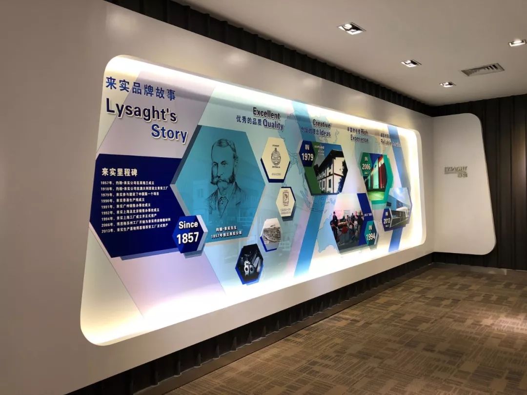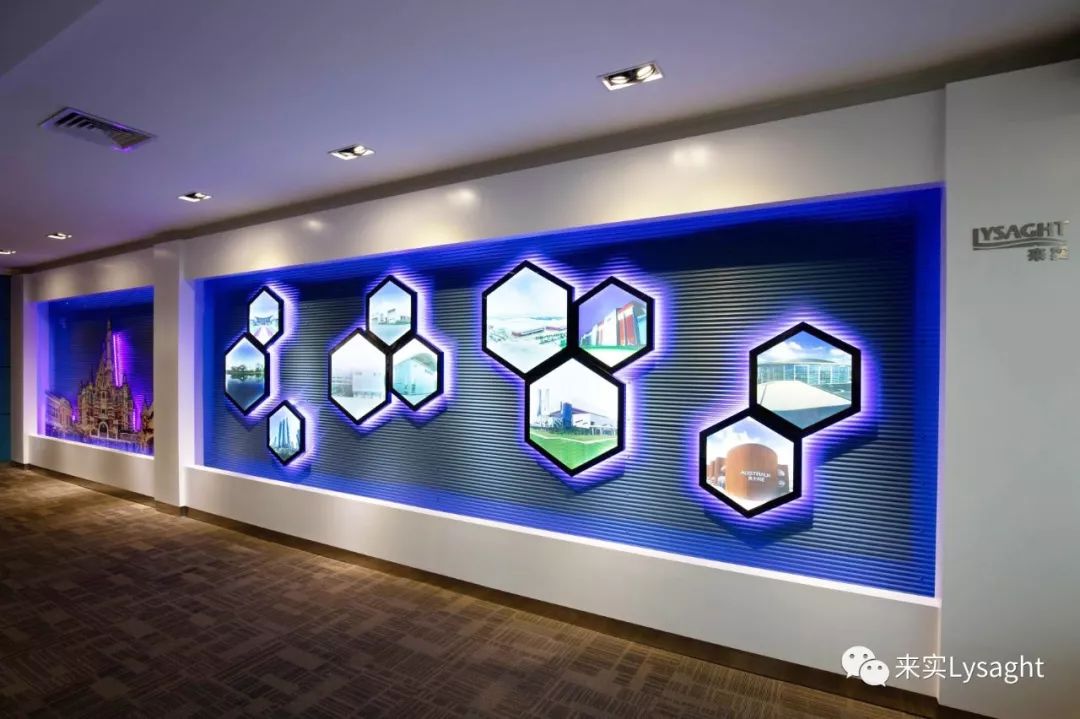 LOGO背景墙采用来实FLEX-LOK?直立锁边板,搭配以蓝色光感,科技感与质感并现。企业发展历程与荣誉墙的结合,彰显了来实百年品牌的实力。