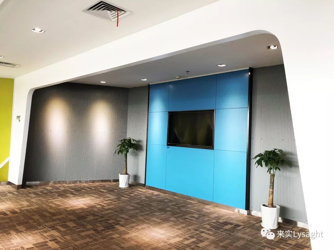最后来到多媒体展示区域,背景墙用蓝色SMARTCLAD?劲平?板与CUSTOM ORB?波纹板相结合,富有创意且凸显主题。